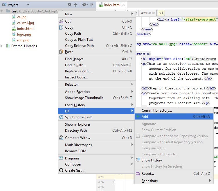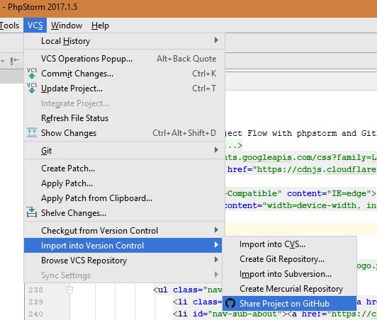 Now that the files are ready for development, it is time to initialize your revision control system with the git functions in phpstorm. There is more than one way to do this, but I am only outlining the way that I have done it in my projects.