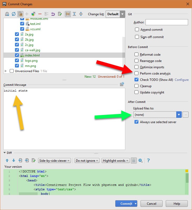 Within the Commit Changes options window, there are a number of options to be aware of. In the image below, the colored arrows point to some important and useful options. The Red arrow indicates that te code analysis option has been turned off. phpstorm will complain about eecms tags with a pop-up if you leave this on. The Gold arrow indicates a required item. You must have some kind of message for every commit. Keep it short to say what you did for this round of changes. Lastly, the Green arrow is an option to upload the committed files to one of your deployment server options. I usually don't use this option as I like to upload files manually between commits for testing anyway.