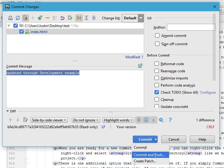 There is one additional option that you should be aware of. If you simply Commit, the changes are recorded in your local copy of the project only. If you are also ready to make the commit available to other team members, you will also need to push the changes. In the commit changes window, the Commit button allows you to choose "Commit and Push" to handle both tasks at the same time.