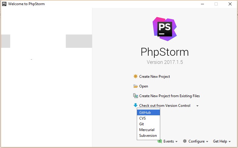 When you do not have an open project in phpstorm, you are presented with the project selection screen. On this screen there is an option to check out from version control. Click on that and choose the GitHub option. Log into your GitHub account if you're prompted to do so.