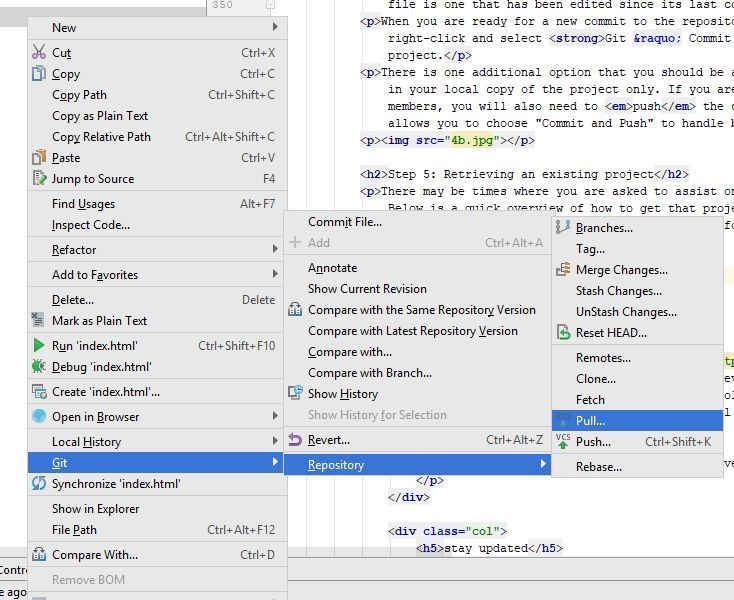 When you are working on the project as other developers, you may need to use some of the other git commands to manage the files to avoid collisions. At times you will be asked to do something for a developer whle they are working on something else. To be sure you are working on the correct version of the code, be sure to do a pull request if you already have the project stored locally.