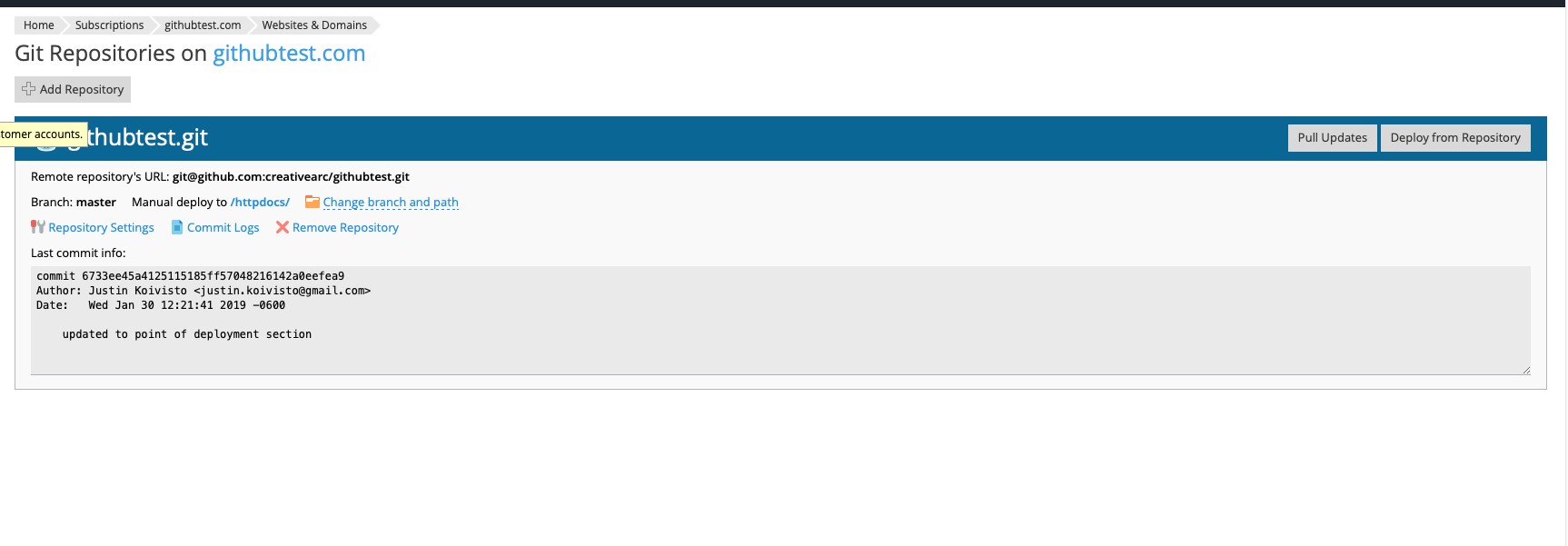 Plesk sees the latest GitHub commit and is ready to pull files.