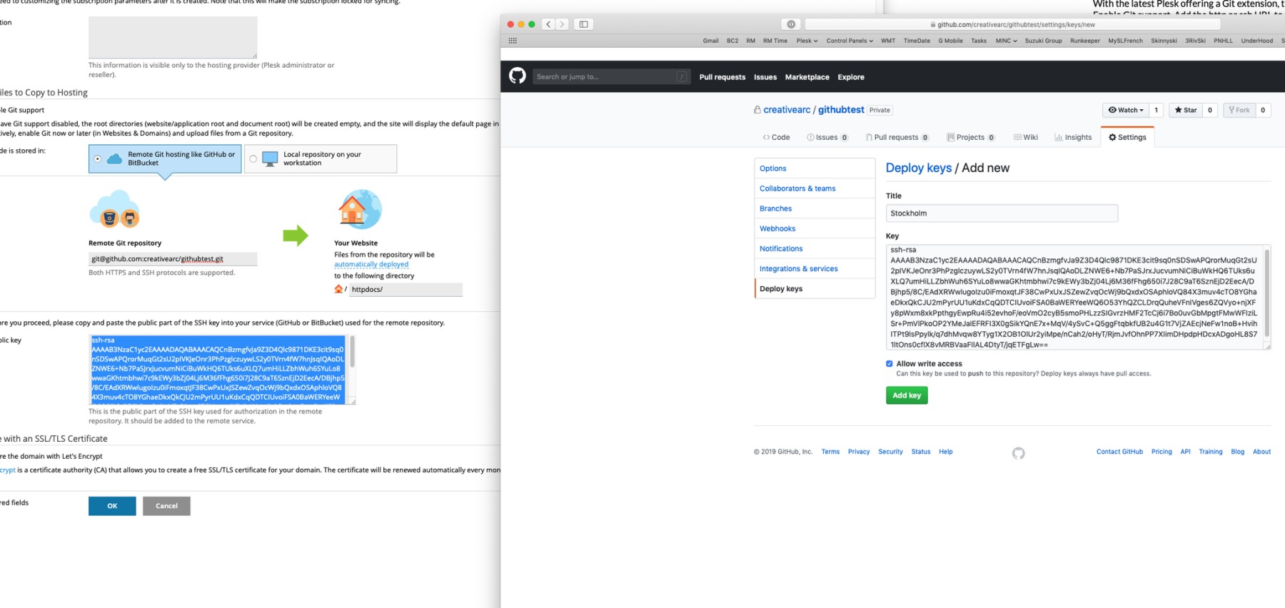 Plesk will supply an ssh key to paste back to the project GitHub. It is under the repository settings for deployment keys. Make sure to allow write access. (This would be something done from the company github account.)