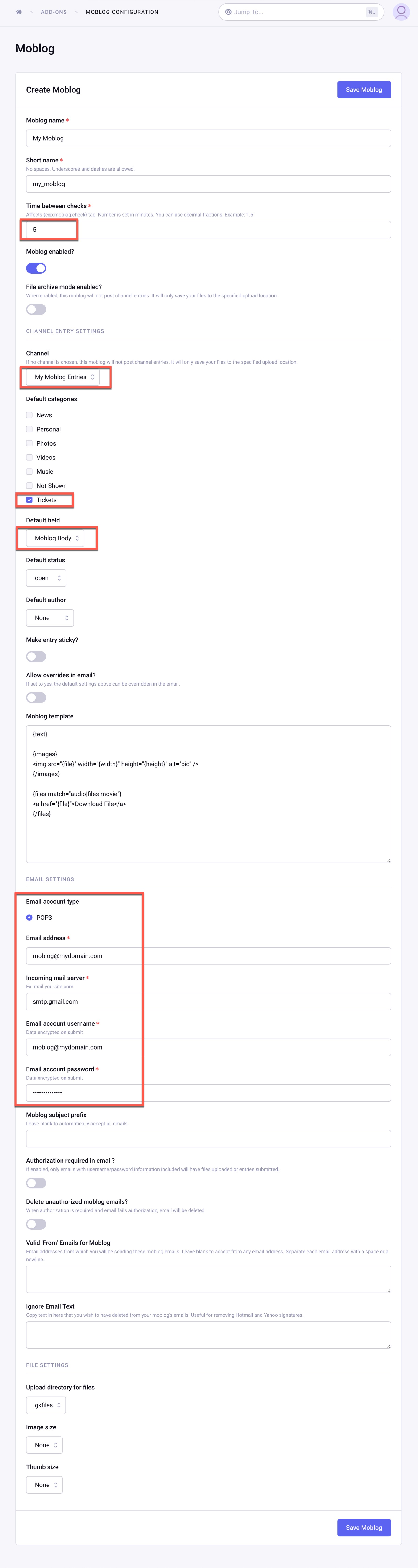 Navigate to the Moblog addon in the ExpressionEngine backend. The settings are self-explanatory to any seasoned EE developer. Below is an example of what we use. The Moblog documentation can point you to the specifics.