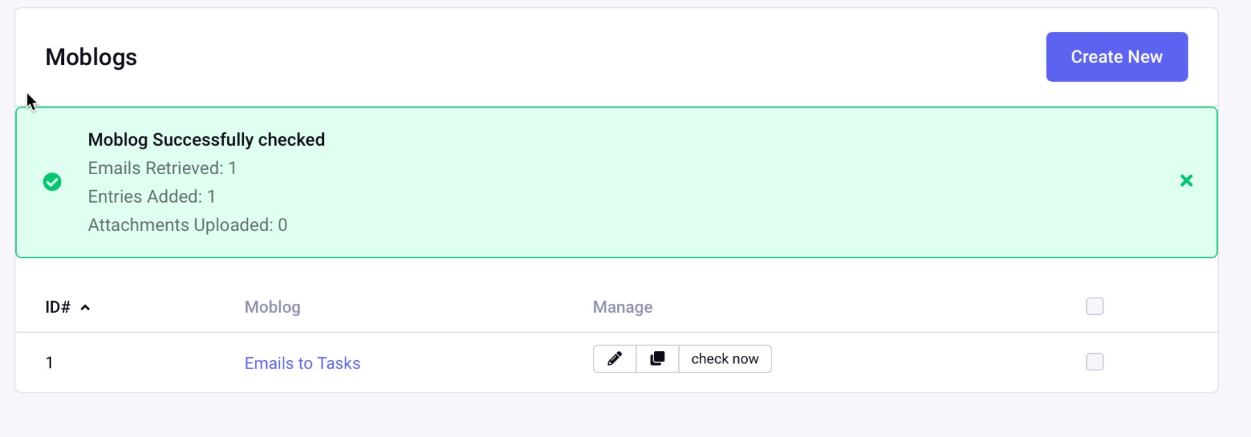 Ideally, the Moblog will report that no new emails could be found, or that it had success retrieving:
