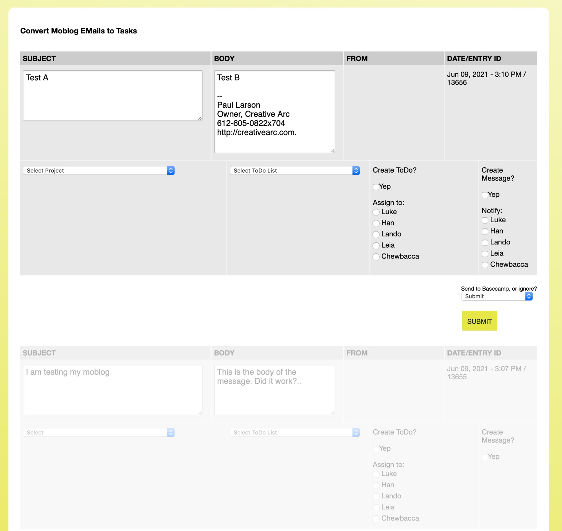 Key functions of this Channel Form: we can select a project, such as ACME Construction, then choose to post the message content to a particular ToDo list, and/or create a Basecamp thread, while assigning individuals as recipients or todo assignees. Upon submitting the form, the channel entries are fed to another template that is easy for the Basecamp API to process, which we detail below.