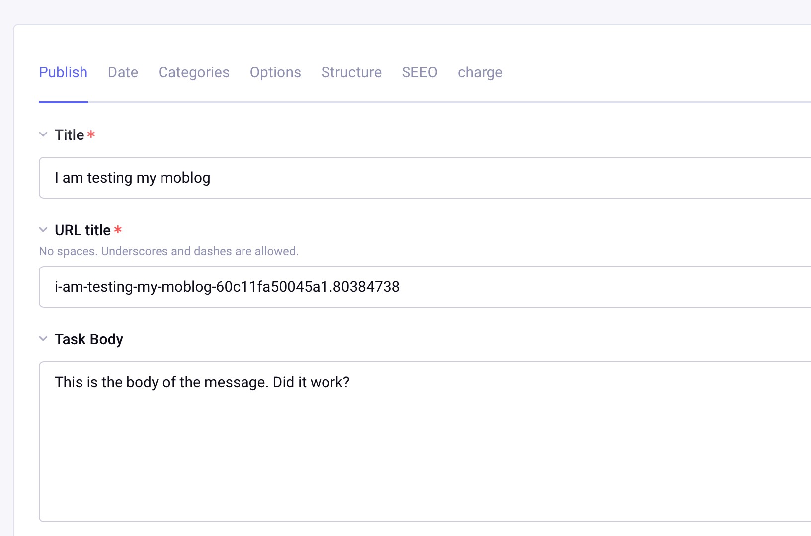 Navigate to your Moblog channel, and you'll see the content that was just imported from your email.