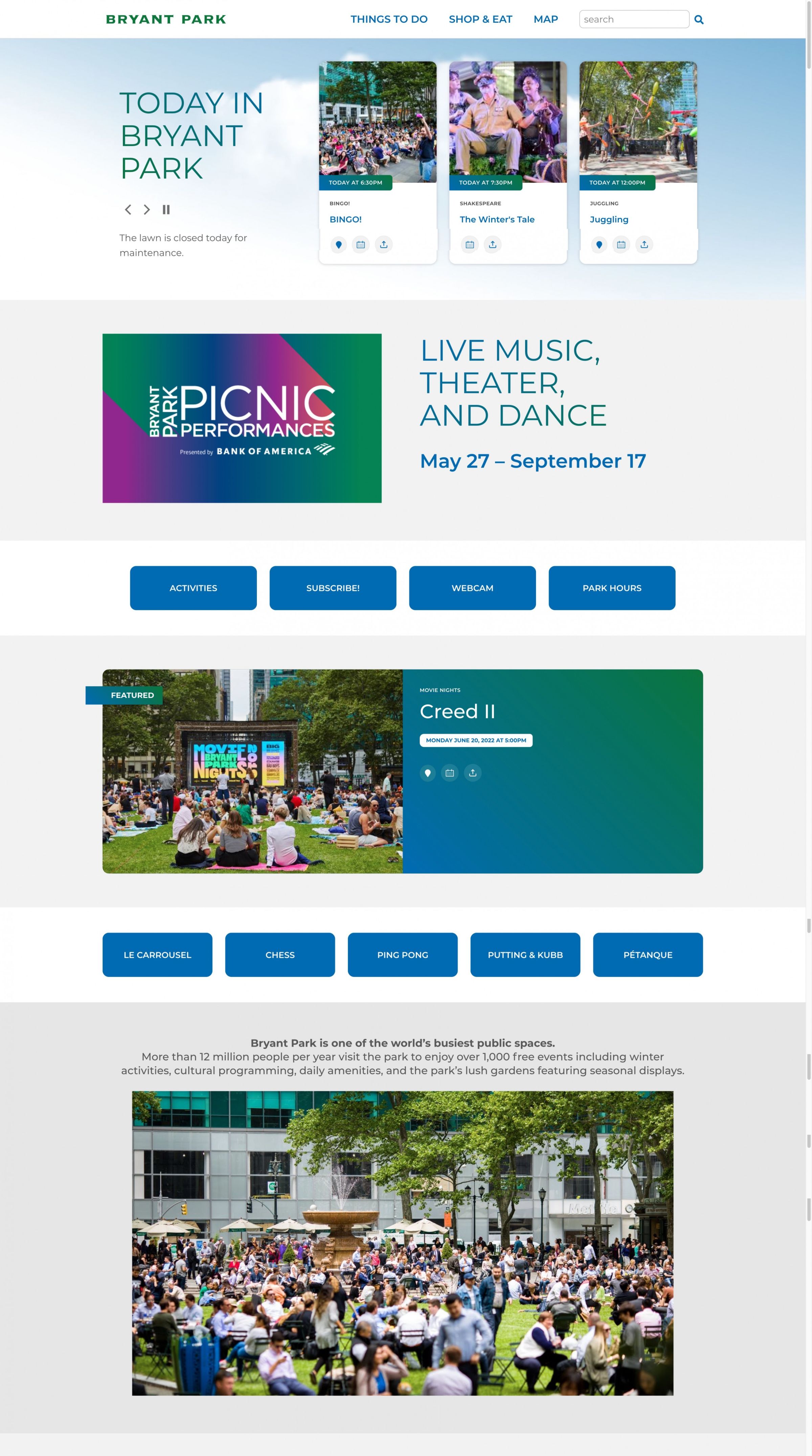 "We have hundreds of free events in Bryant Park year-round, so it was very important to us to represent the complexity of our programming in a simple and seamless manner online, while also showcasing the magic and allure of the physical park. Creative Arc’s hands-on attention to our needs, technical know-how, flexible design, and strong collaboration made this vision a reality."