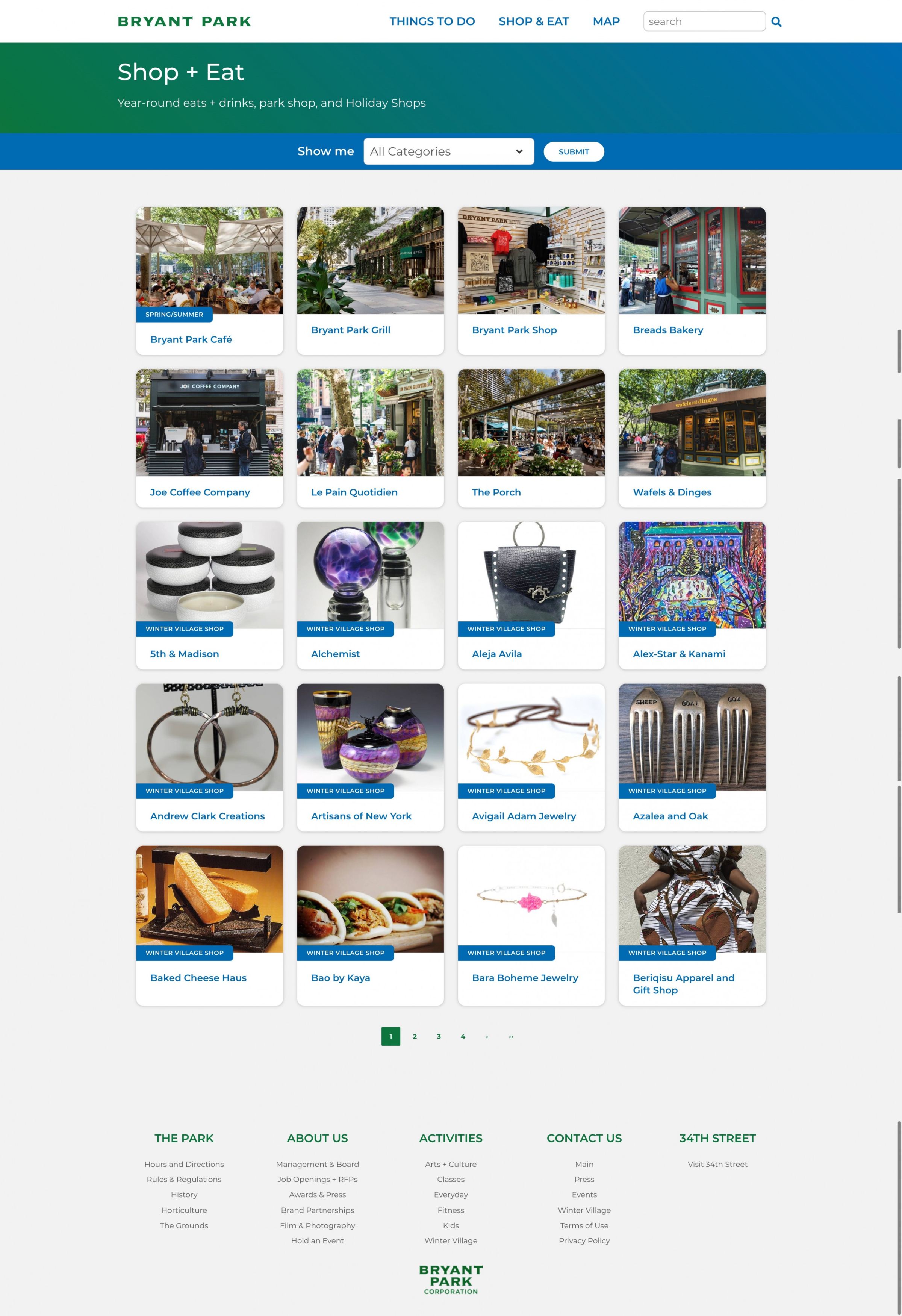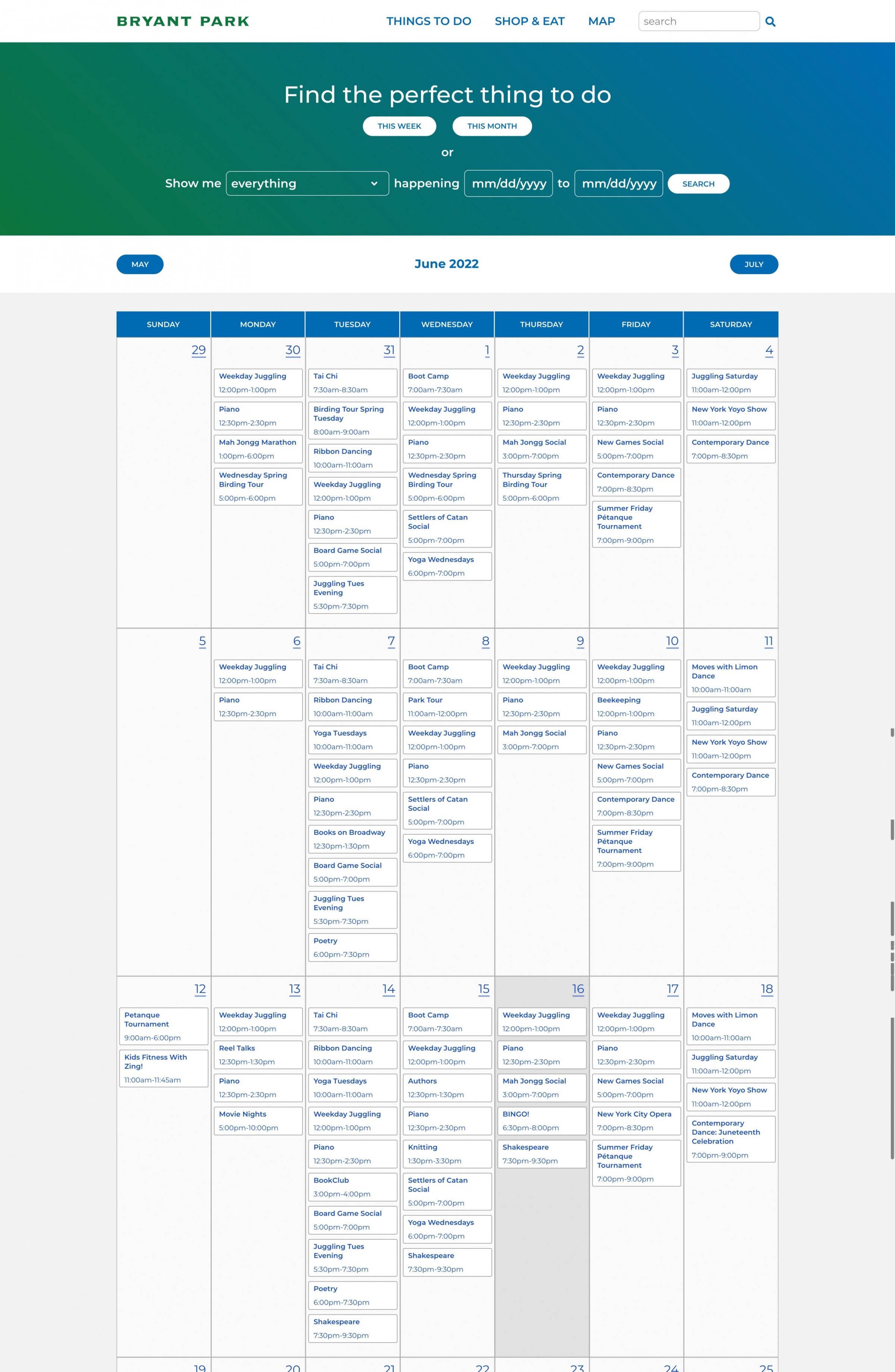 As the only large-scale public park in Midtown Manhattan, Bryant Park is a much sought-after location for concerts, product launches, and commercial activations. With so much activity, the website design and development needed to focus on ease-of-use and efficiency. Events, activites and announcements needed to be filtered by date range, category and type. Mobile usability was a main priority, with thousands of visitors each day.