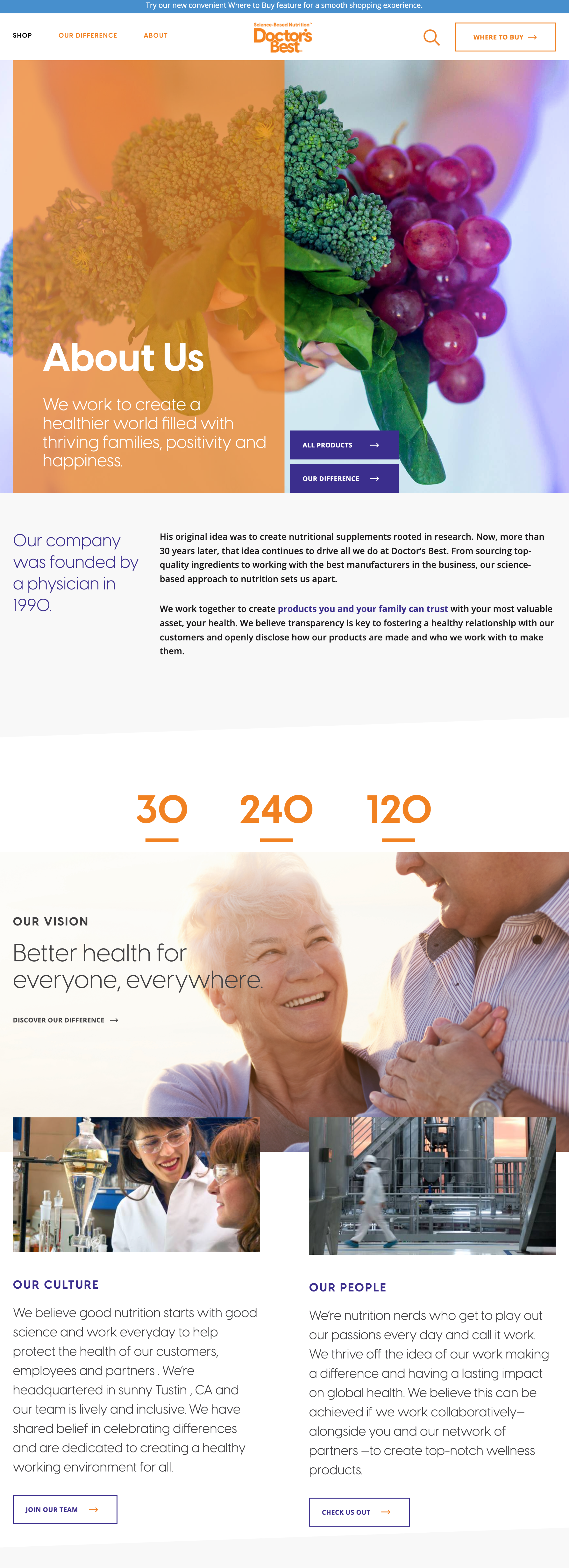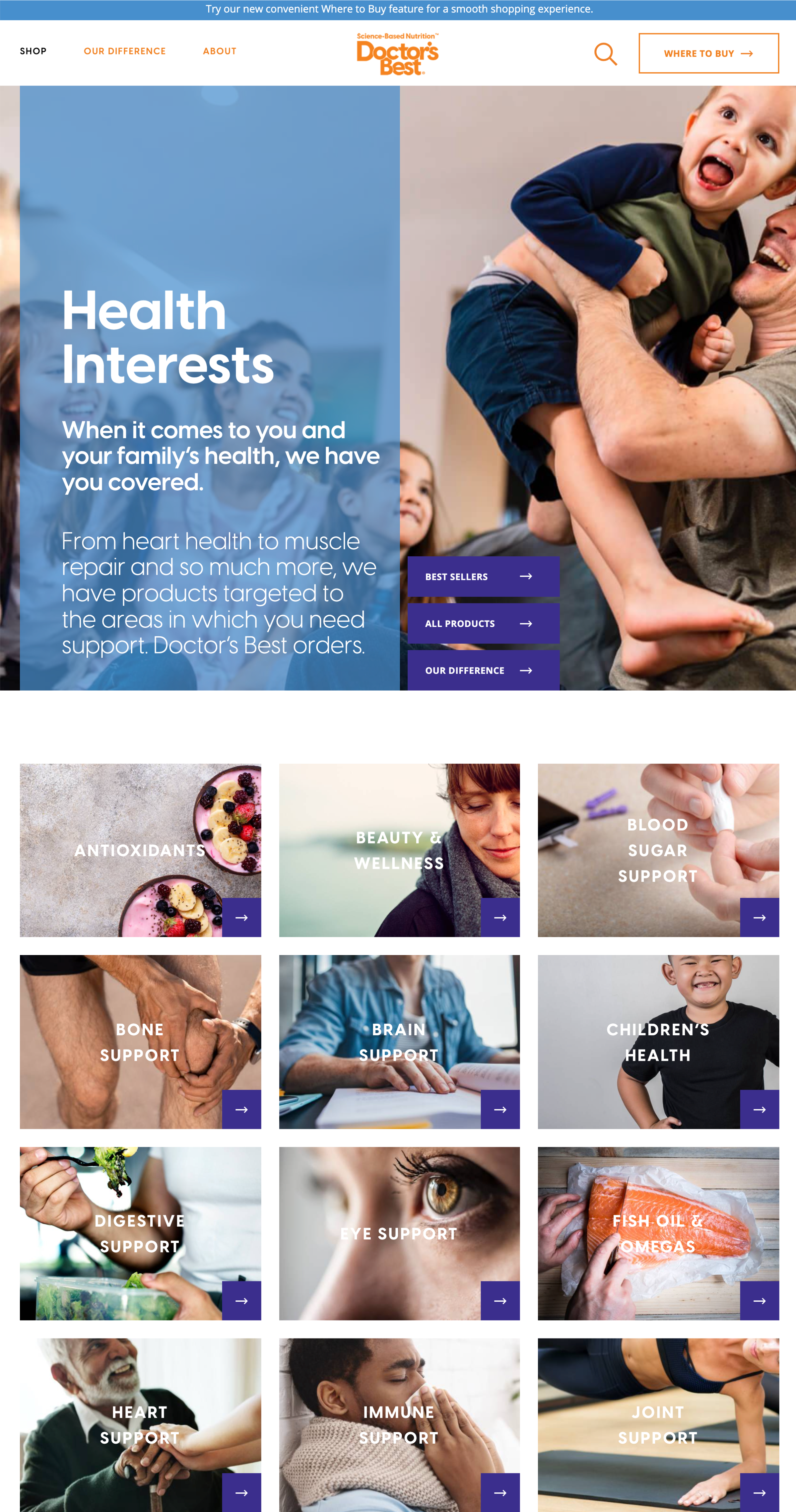 The redesigned website aimed to improve product browsing by separating items into Health Interests, while integrating a "Where to Buy" map for finding a local retailer. Product sections needed to provide contextual functionality or filtering appropriate for a wide range of product types.