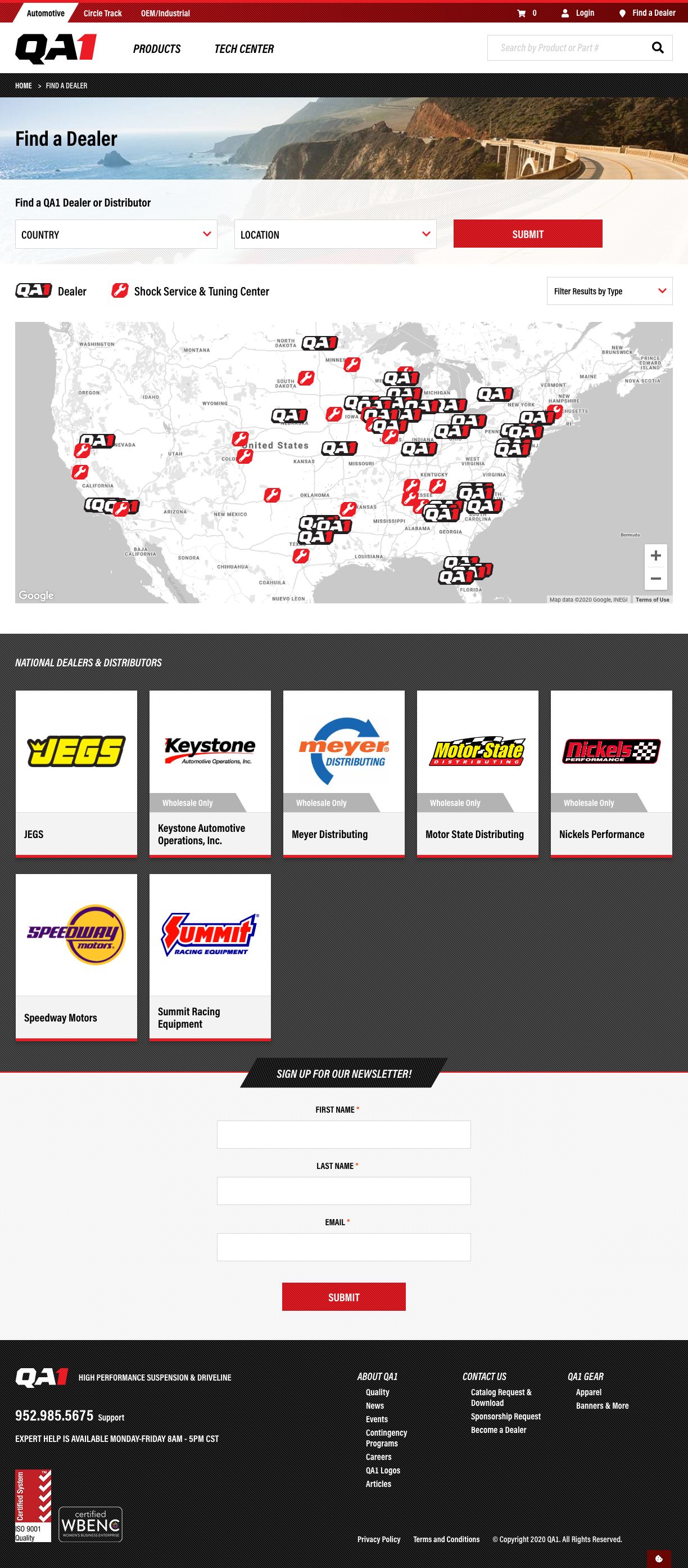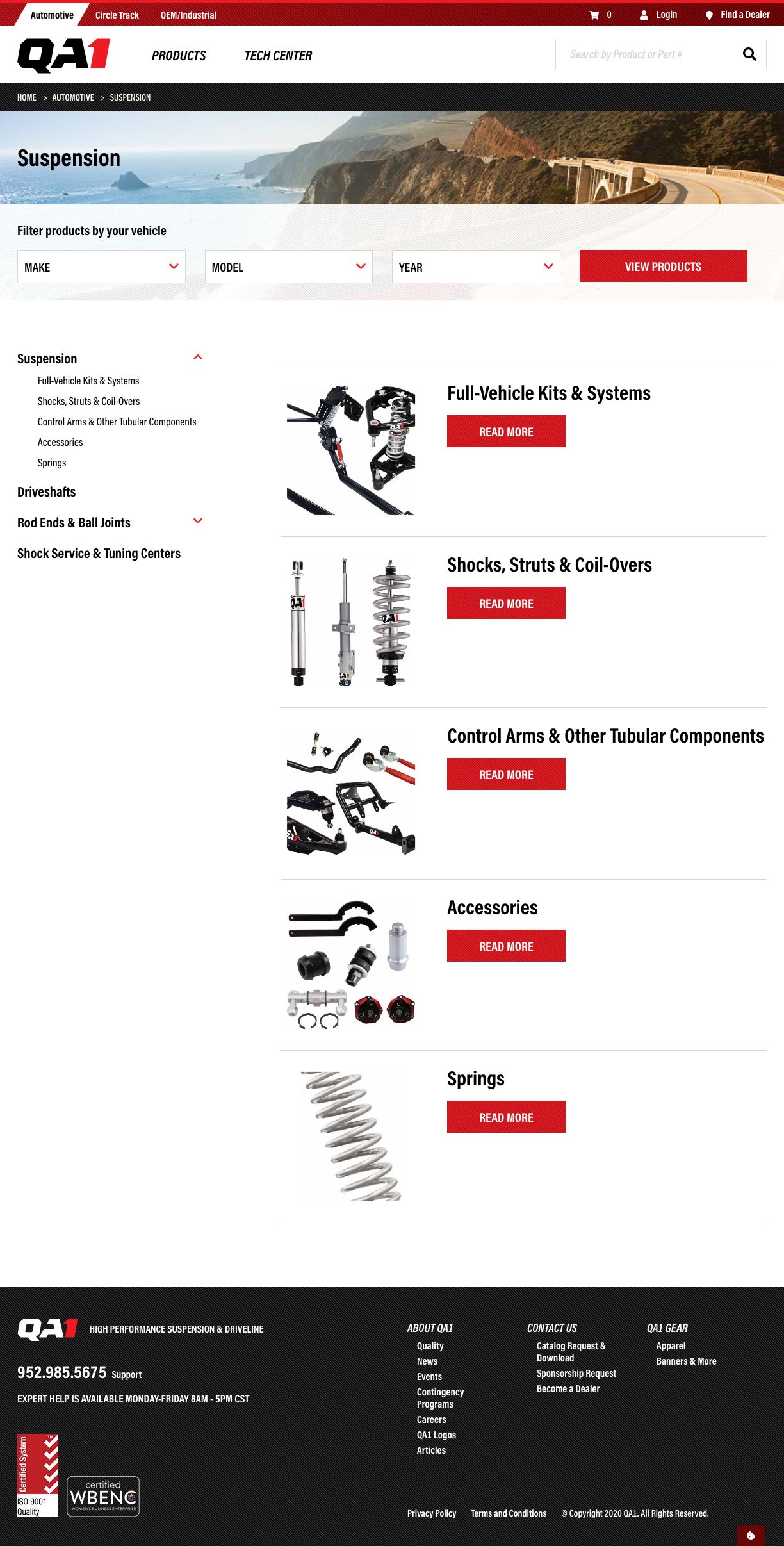 Creative Arc designed and developed a responsive website with nearly all content areas easily managed by QA1's staff. Product detail pages, resources, vehicle make/model are managed by a custom interface within the content management system (CMS). Product specification details are synchronized regularly using a series of schedule tasks configured by Creative Arc.